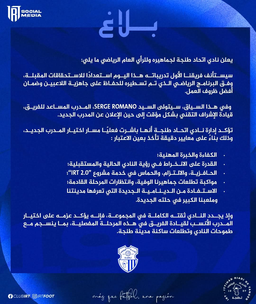 وفي ظل المستجدات التقنية التي يعيشها الفريق، كشف البلاغ أن مهمة الإشراف على التداريب ستُسند مؤقتاً للمدرب المساعد سيرج رومانو، إلى حين الإعلان عن هوية المدرب الجديد الذي سيقود فارس البوغاز خلال المرحلة القادمة.