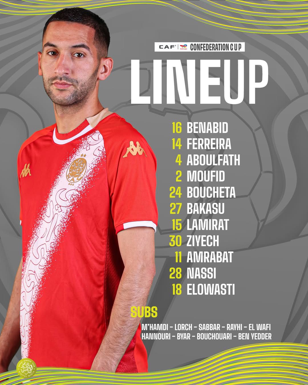 حدد محمد أمين بنهاشم، مدرب الوداد الرياضي، التشكيلة الأساسية للفريق الأحمر، التي ستواجه مانييما الكونغولي، اليوم الأحد 25 يناير 2026، برسم الجولة الثالثة من دور المجموعات من مسابقة كأس الكونفدرالية الإفريقية.