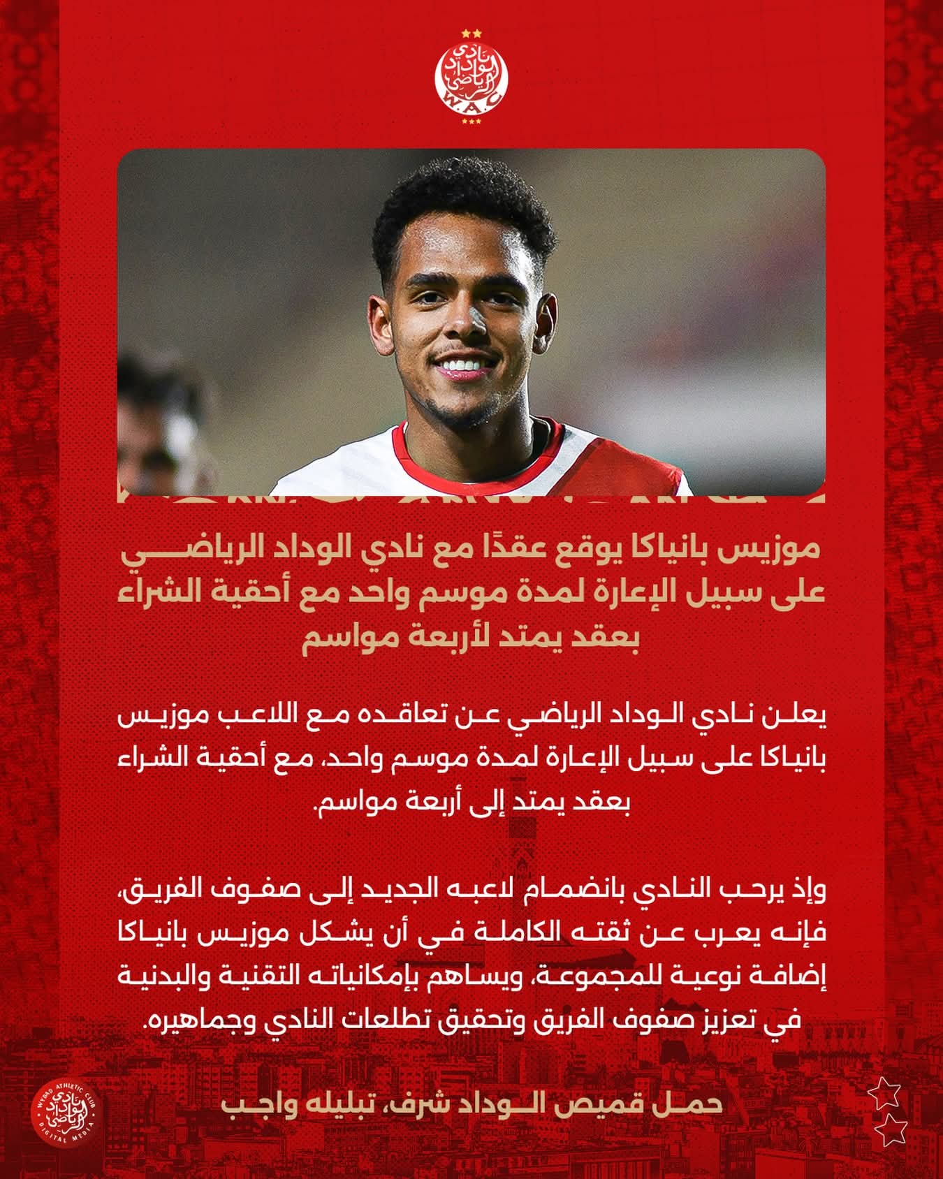 شاركها واتساب فيسبوك تويتر لينكدإن بينتيريست البريد الإلكتروني تيلقرام Threads عصام أيت علي أعلن نادي الوداد الرياضي، اليوم الثلاثاء 20 يناير 2026، عن تعاقده مع اللاعب موريس بانياكا. وذكر بلاغ الوداد أن الفريق تعاقد مع موريس على سبيل الإعارة لمدة موسم مع أحقية الشراء بعقد يمتد إلى أربعة مواسم. وفي ما يلي بلاغ الوداد: