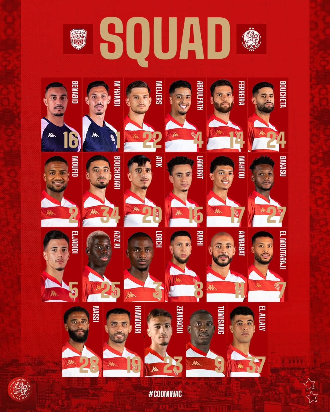 اختار أمين بنهاشم، مدرب فريق الوداد الرياضي لكرة القدم، قائمة لاعبيه لمواجهة النادي المكناسي، اليوم الجمعة 3 أكتوبر 2025، ضمن منافسات الجولة الرابعة من البطولة الاحترافية.