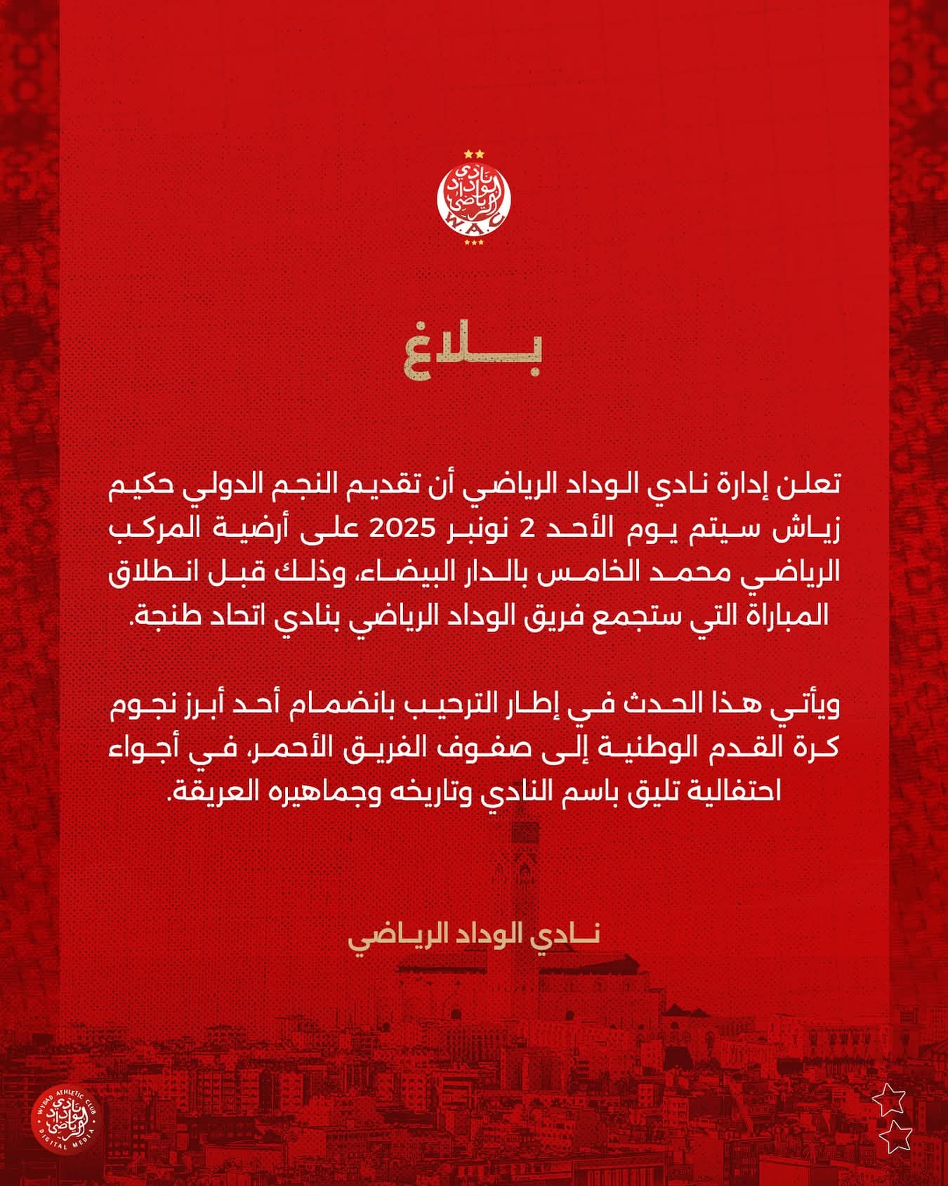 شاركها واتساب فيسبوك تويتر لينكدإن بينتيريست البريد الإلكتروني تيلقرام Threads راديو مارس – الدار البيضاء كشفت إدارة الوداد الرياضي أن حكيم زياش سيتم تقديمه إلى جمهور الفريق الأحمر، يوم الأحد 2 نونبر 2025، برسم المباراة التي ستجمعه باتحاد طنجة، في ملعب المركب الرياضي محمد الخامس بالدار البيضاء. وفي ما يلي بلاغ الوداد: