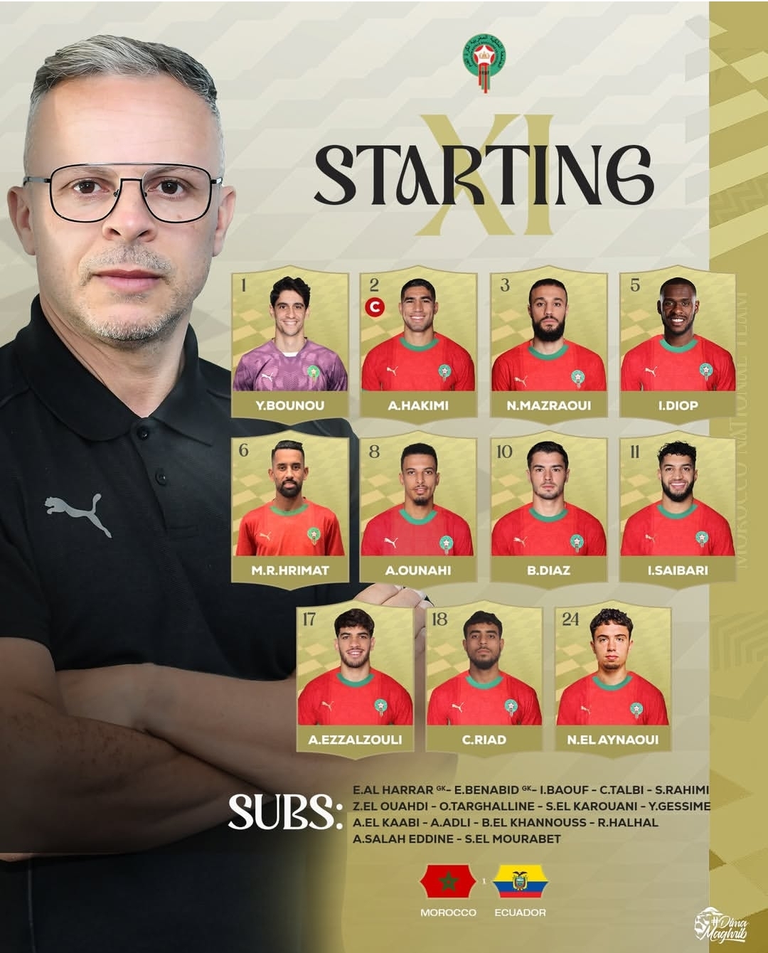 حدد الناخب الوطني، محمد وهبي، تشكيلة المنتخب الوطني، التي ستواجه يومه الجمعة 27 مارس 2206 في لقاء ودي منتخب الإكوادور.